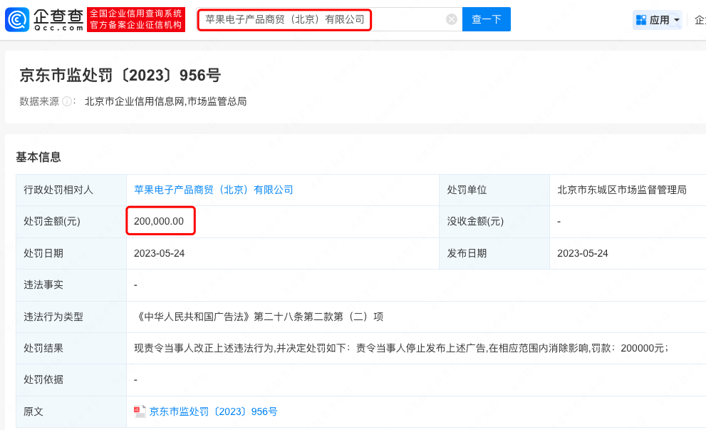 企查查APP显示,近日,苹果电子产品商贸(北京)有限公司因发布虚假广告被北京市东城区市场监督管理局行政处罚20万元。
