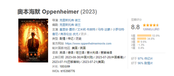 诺兰新片《奥本海默》豆瓣分涨至8.8!AI预测总票房仅3.41亿