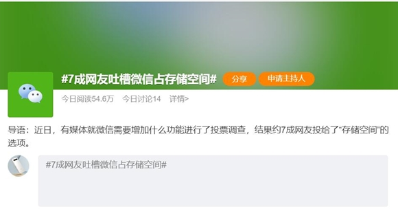最近,微博上出现了一个话题“7成网友吐槽微信占用存储空间”的讨论,引发了广泛的热议。