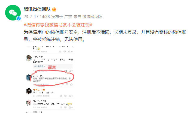 腾讯微信团队微博发文表示,微信有零钱的微信号就不会被注销。