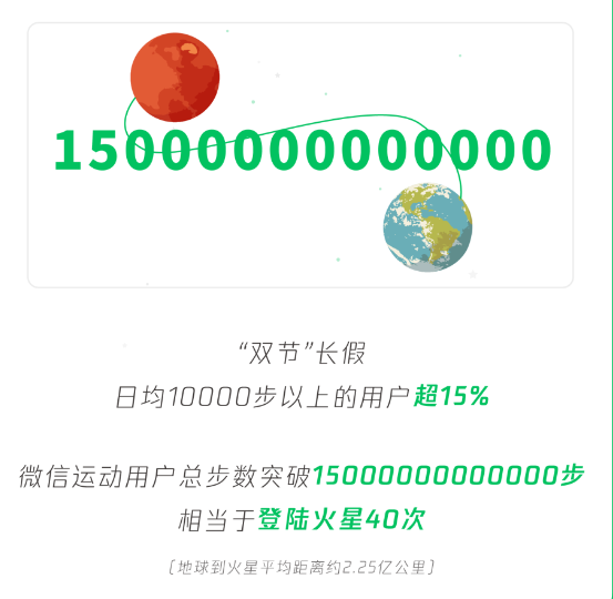 中秋国庆假期微信用户总步数突破15万亿 相当于登陆火星40次
