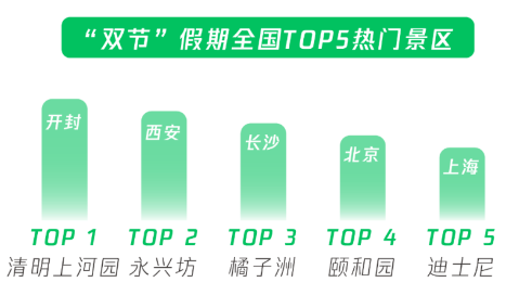 微信报告还显示,双节”假期全国TOP5热门景区分别为:开封清明上河图、西安永兴坊、长沙橘子洲、北京颐和园、上海迪士尼。