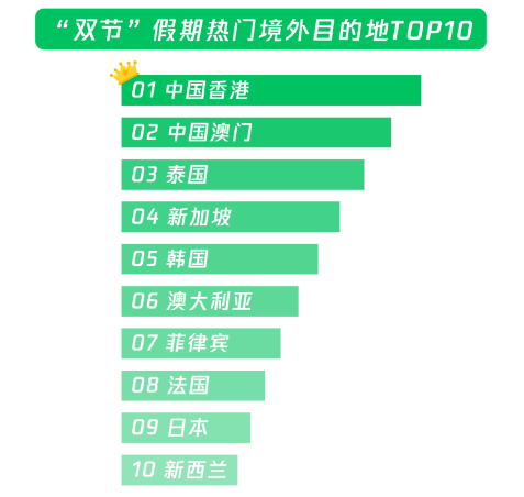 双节”假期热门境外目的地TOP10为:中国香港、中国澳门、泰国、新加坡、韩国、澳大利亚、菲律宾、法国、日本、新西兰。