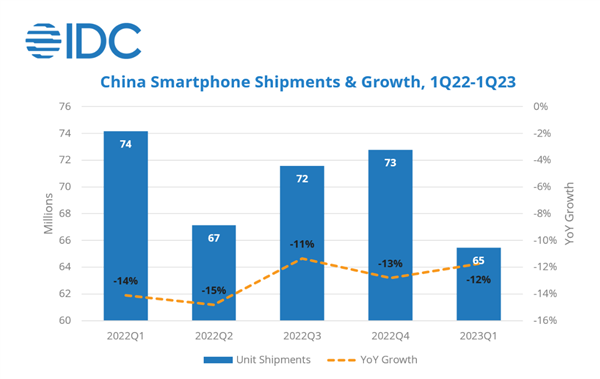 IDC数据显示,2023年第一季度,中国智能手机出货量6540万台,年同比下滑11.8%。事实上,从2022年第一季度起,这一数据已经连续5个季度同比暴跌。