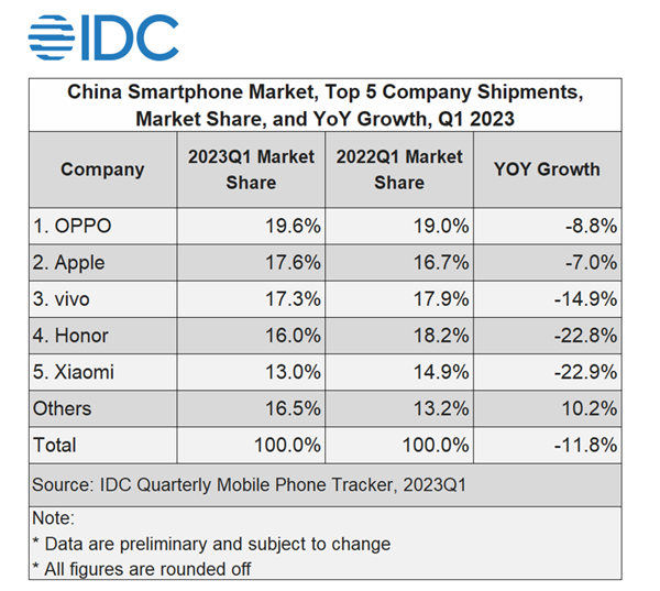 从TOP5品牌来看,OPPO、苹果、vivo、荣耀、小米无一例外都遭遇了同比下滑。