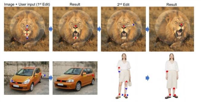 论文示例展示了在一个简单的界面中,用户可以将他们在图像中定义的点拖动到所需的位置,就是实现图片编辑。例如,让猫咪闭上眼睛,让狮子转头并张开它的嘴,或将汽车转换为另一种模型。