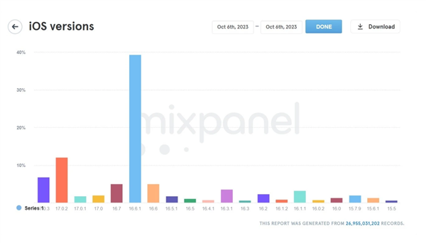 数据中,有12.13%的用户使用iOS 17.0.2系统,6.84%用iOS 17.0.3,2%的坚持使用iOS 17。作为对比,而iOS 16.6.1、16.7加起来的用户大约为45%。