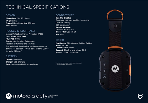 Defy Satellite Link搭载了联发科芯片,并配备600mAh电池,其余功能还包括eSIM、GPS、GLONASS、Galileo、蓝牙5.1等。