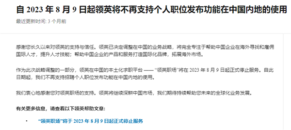 今年5月,海外招聘龙头”领英突然发文,宣布领英在中国的本土化求职平台领英职场”将于2023年8月9日起正式停止服务,该应用于去年12月14日上线。