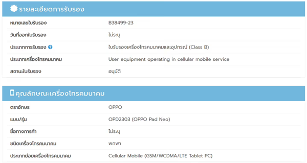 近日又有一款名为OPPO Pad Neo的平板,现身于泰国NBTC认证网站,并通过了该认证,这是OPPO的第四款平板。
