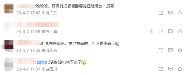 对此,有网友表示:怎么咽下去的,一进嘴没感觉不对劲吗?”这耳机质量很好,胃酸1.5没给整破防”,另外,也有人建议赶紧去医院,电池有毒的,可不是闹着玩呢”。