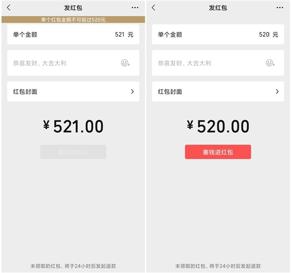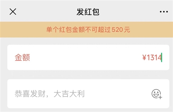 0点一过,微信红包的金额上限已经特别从200元调整为520元,方便情侣之间互相表达心意(晒朋友圈...)。