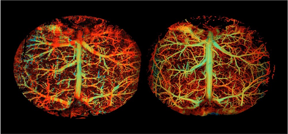 小鼠大脑血流的视图(左)以及使用 AI 工具提高图像质量和准确性后得到的相同视图。图源:杜克大学 Junjie Yao、Xiaoyi Zhu 。