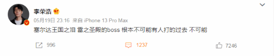 歌手李荣浩昨晚还在玩《王国之泪》,并且在深夜发文吐槽:雷之圣殿的boss吉波得女王太难了,根本不可能有人打的过去,结果却被网友嘲笑是自己太菜。