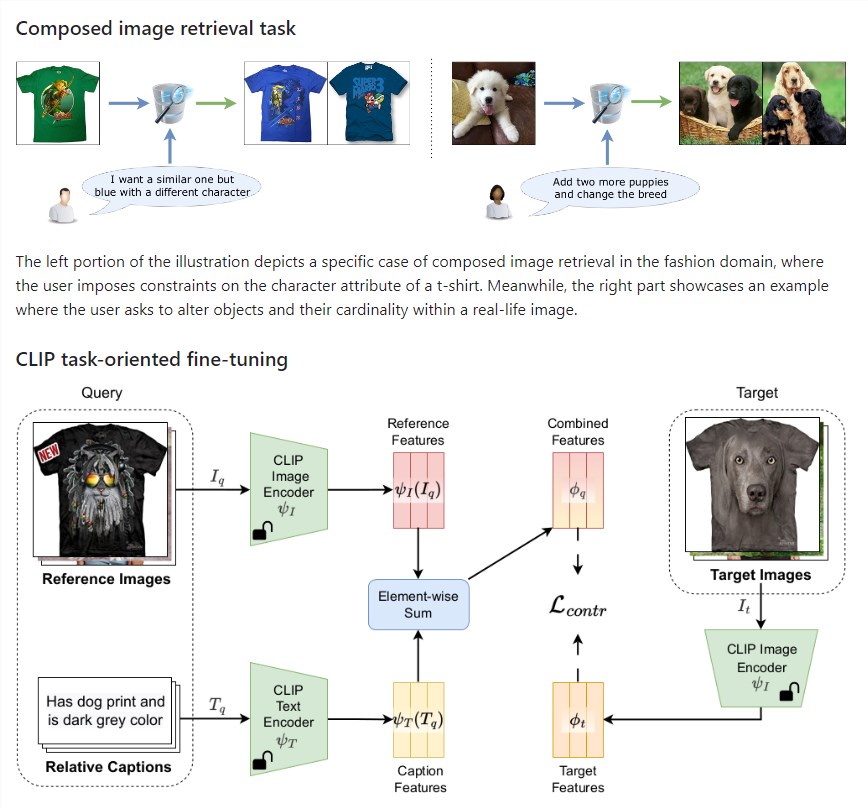 Clip4Cir采用了一种搜索图片的方法,图片看起来像给定的图片,但是在标题中描述了变化。它使用了增加了特殊技巧的 CLIP 模型。该方法在流行的图像搜索数据集 FashionIQ 和 CIRR 上表现更佳。