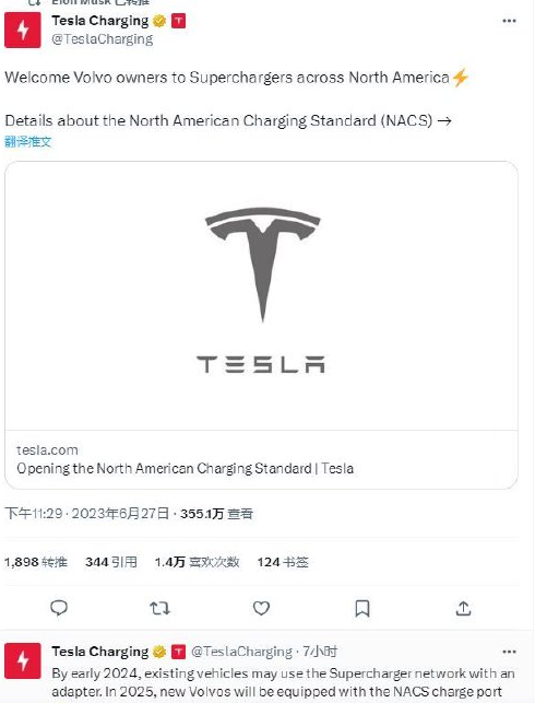 特斯拉的官方账号Tesla Charging在周二下午的推特上也发布了这一消息,欢迎沃尔沃车主使用北美各地的超级充电站,预计到2024年初,现有的沃尔沃电动车可以通过一个适配器连接到超级充电站网络,而到2025年,新款沃尔沃将直接配备NACS充电接口。