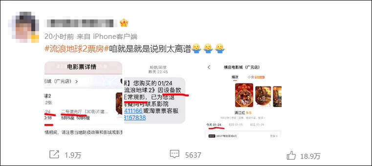 1月24日晚间,有微博网友反映,自己购买的《流浪地球2》电影票被影院以“设备故障”为理由退款后,发现影院又将当天同一时段的同一放映厅让给了同期上映的《满江红》,引发争议。