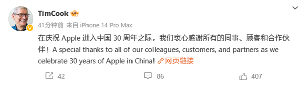今天上午苹果公司CEO蒂姆库克通过微博发文,庆祝苹果进入中国30周年,并表示衷心感谢所有的同事、顾客和合作伙伴”。