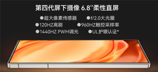 手机正面则是一块6.8英寸全面屏,屏幕无任何挖孔,分辨率为2480*1116,支持120Hz高刷。