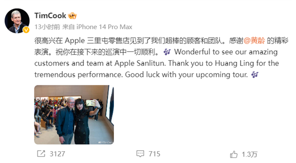 3月23日下午,苹果公司CEO蒂姆库克现身北京三里屯Apple Store苹果零售店,引发关注。他热情地和店内顾客、粉丝、店员等同框拍照,还在微博晒出了与歌手黄龄的同框合影。