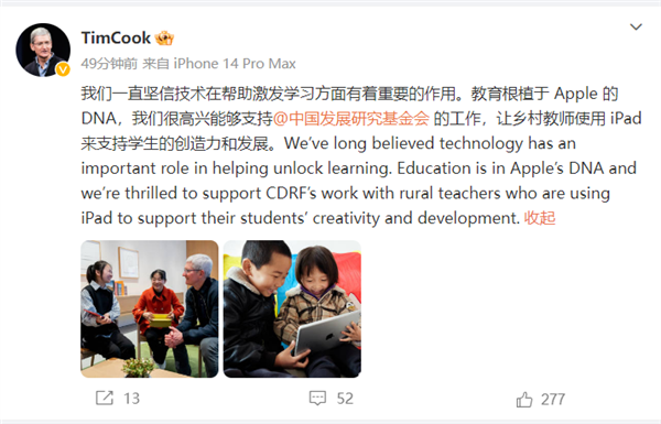 今天一早,库克发微博称:我们一直坚信技术在帮助激发学习方面有着重要的作用。教育根植于Apple的DNA,我们很高兴能够支持@中国发展研究基金会的工作,让乡村教师使用iPad来支持学生的创造力和发展。”