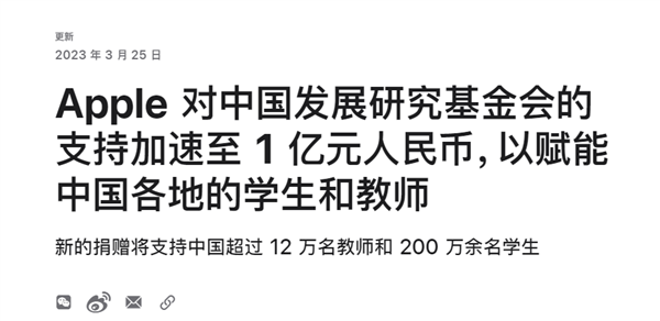 与此同时,苹果官方宣布,对中国发展研究基金会的捐助增加至1亿元人民币,以为中国各地的教师和学生创造成长机会。