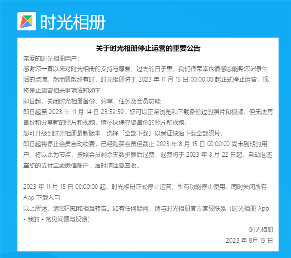时光相册官方还表示,已经购买会员但截至2023年8月15日00:00:00尚未到期的用户,将以此为节点,按照会员剩余天数折算后退费。退费将于2023年8月22日起自动退还。