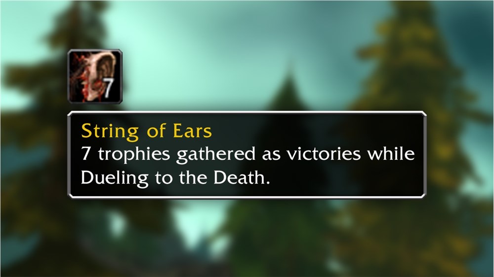 由于炫耀的权利非常重要,我们会追踪你在死亡决斗中杀死的人数,在你的角色上用一个叫「一串耳朵」的特殊造型增益效果来显示。每次你在死亡决斗中获胜,你会收到一个「战利品」,这个增益效果上的叠加数量就会提高1 层。任何点击你角色的人,都可以看到你收集的耳朵数量,借此知道你是多么令人畏惧的战斗者。不过,这也有些限制,你在10 级之前无法获得「一串耳朵」增益效果,另外,如果你跟你的对手等级相差太大,你也无法获得这个增益效果。