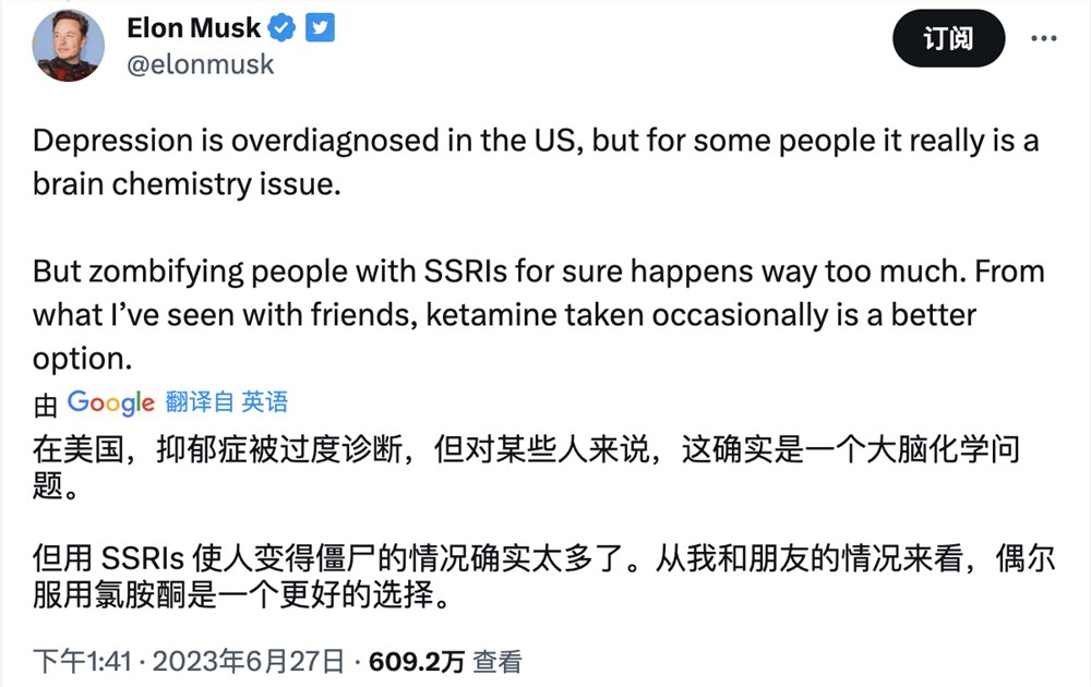 “在美国,抑郁症被过度诊断了,但对一些人来说,这真的是一个脑化学问题,”马斯克周二凌晨发布推文称,“但是抗抑郁类药物(SSRI,选择性血清再吸收抑制剂)把人变成僵尸的情况确实发生得太多了。根据我对朋友的观察,偶尔服用氯胺酮是一个更好的选择。”
