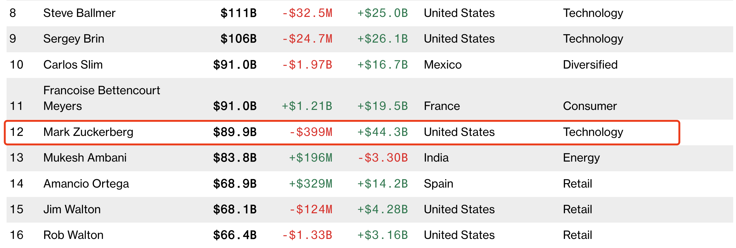 这些努力似乎取得了回报。扎克伯格今年的财富增长了443亿美元(约合3104亿元人民币),是彭博亿万富翁指数追踪的所有富豪中增长最多的。扎克伯格的财富主要由他所持有的Meta股份构成。