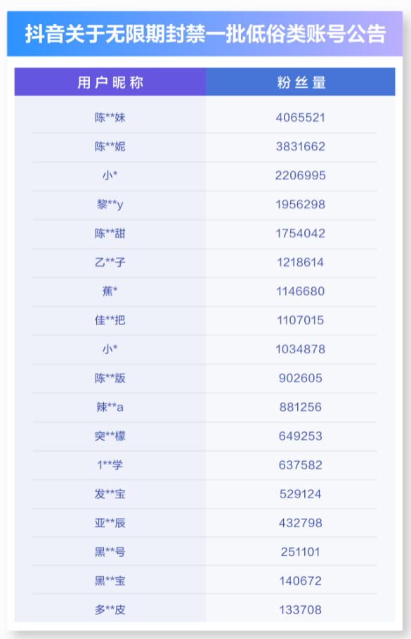 抖音表示,上述行为,严重违反了平台规则,抖音对其进行了严格处置,对“陈**甜”“陈**妮”等22个账号实施了无限期封禁处置,并对其不当获取粉丝进行抹除,取消其直播带货等营利权限。