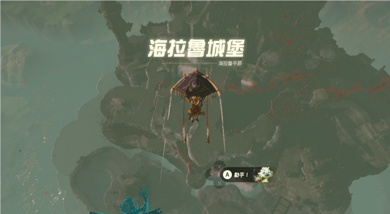 玩家在监视堡垒开启第一个鸟望塔后,利用弹射到最高处的方式,以滑翔伞直接朝着北方的海拉鲁城堡飞过去,靠近城堡后会看到像是下图中凸出来的长型道路,直接往内走就会到达城堡的1F 楼层,进入室内后稍微环顾一下就会找到王座(-0255 1087 0349)。