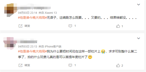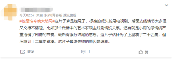不少看了大结局的网友吐槽:这片子算是烂尾了,标准的虎头蛇尾电视剧,后面支线情节太多但又交待不清楚,最后有强行结尾的意思”无语,这编剧怎么既要又要的,结果啥都没”。