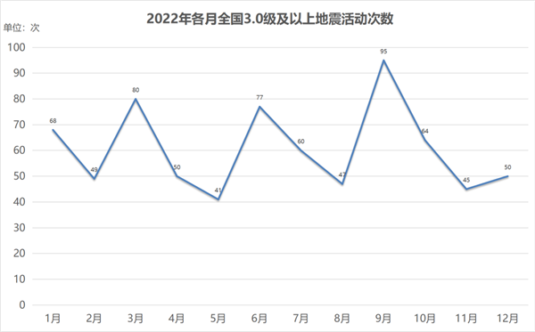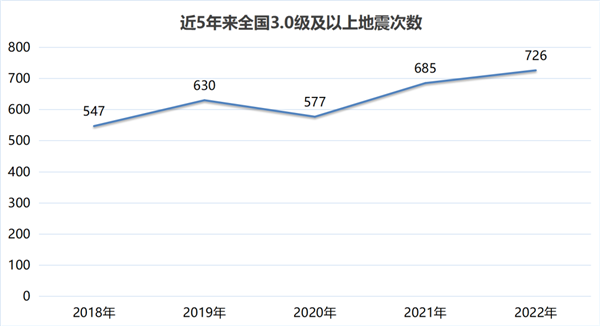 根据中国地震台网统计,2022年,我国共发生3.0级及以上地震726次,其中3.0到3.9级526次,4.0到4.9级147次,5.0到5.9级43次,6.0级到6.9级10次,7.0级以上0次。