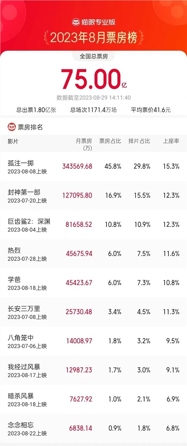 2023年8月总票房破75亿!《孤注一掷》断崖式领先