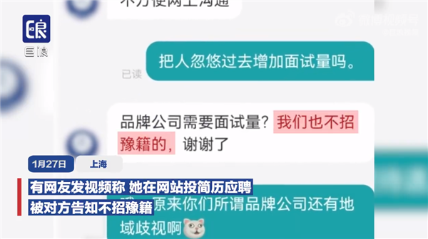 1月27日,上海。有网友发视频称,她在网站投简历应聘,被对方告知不招豫籍。