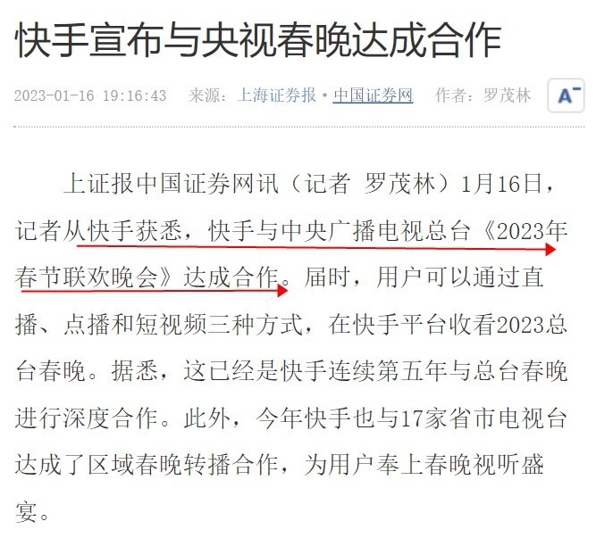 与此同时,今日,抖音和快手也先后宣布和中央广播电视总台《2023年春节联欢晚会》达成合作。