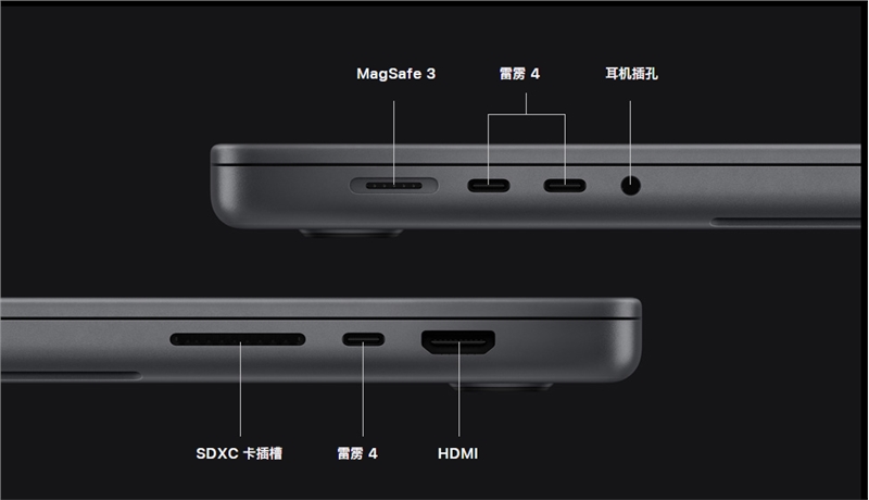 接口方面,新款MacBook Pro内置 SDXC 读卡器、HDMI 输出端口,支持最高达8K 的分辨率、三个雷雳4端口、一个耳机插孔、MagSafe3充电接口。