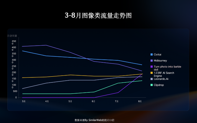 这一趋势可以从数据上明显看出,例如 Midjourney作为尝鲜用户的优选,其数据量开始呈现下滑趋势,而像 Adobe系列这样偏专业向的产品,用户规模则在稳步提升。