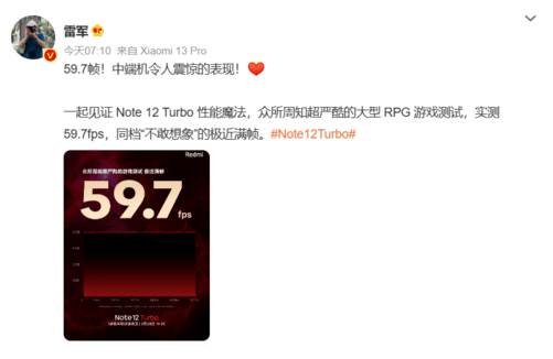 3月23日消息,今天小米官方公布了Redmi Note 12 Turbo新机实测数据,对此小米创始人雷军在社交平台发文称,中端机令人震惊的表现。Redmi Note 12 Turbo在大型RPG游戏测试中,实测59.7fps,同档“不敢想象”的极近满帧。小米官方称其为性能魔法,目前该机已经上架预约,3月28日正式发布。