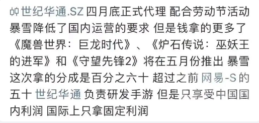 原话是:世纪华通.SZ四月底正式代理配合劳动节活动,暴雪降低了国内运营的要求但是钱拿的更多了,《魔兽世界:巨龙时代》、《炉石传说:巫妖王的进军》和《守望先锋2》将在五月份推出,暴雪这次拿的分成是百分之六十超过之前网易-S的五十,世纪华通负责研发手游,但是只享受中国国内利润国际上只拿固定利润。
