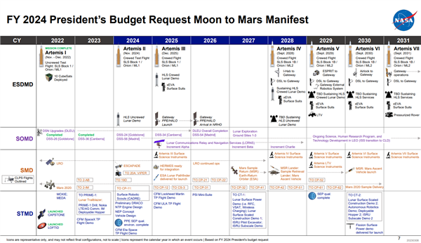 负责21世纪登月的NASA美国宇航局此前公布了路线图,美国重返月球的阿耳忒弥斯计划(Artemis)在2022年底实现了SLS火箭发射测试,2023年没有相关任务,2024年11月则会发射阿耳忒弥斯2号测试任务,实现4人绕月但不登月的目标。
