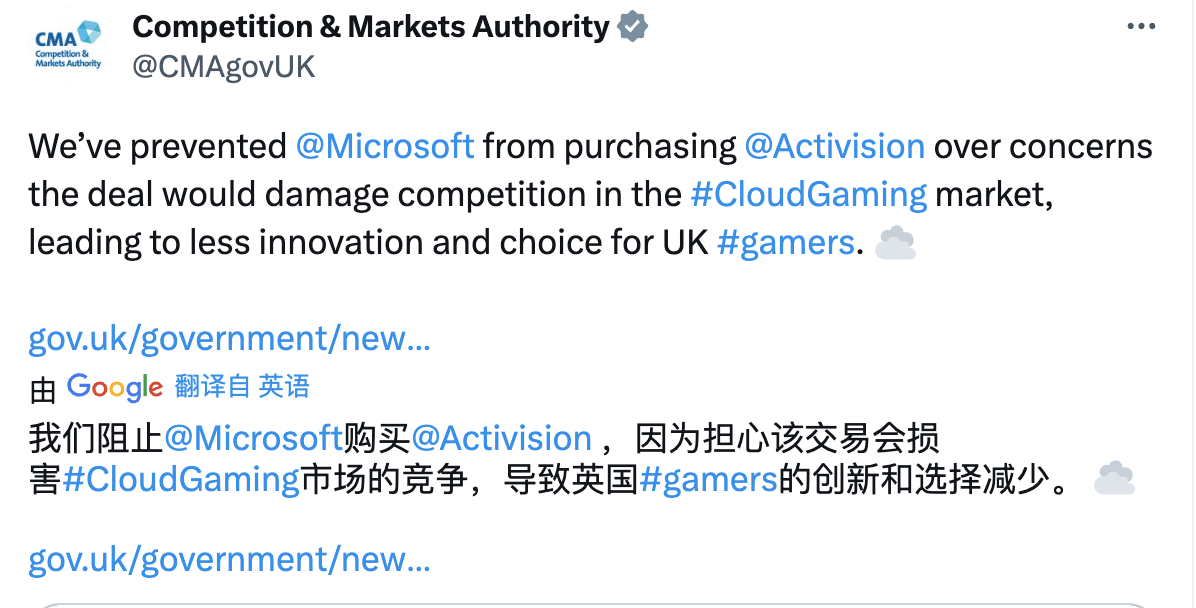 此前,英国一直“紧跟”美国,反对微软收购动视暴雪。今年4月,英国反垄断监管机构竞争和市场管理局(CMA)表示,已阻止微软收购动视暴雪的交易,原因是担心此交易会损害云游戏市场的竞争,削弱创新,导致未来游戏玩家的选择变少。