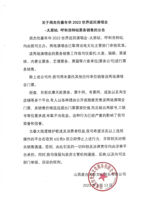 3月13日,落款为山西星台光影文化娱乐的公司以演唱会主办方的名义发布公告,表示太原站、呼和浩特站两地演唱会已取得当地文化主管部门审核批准。