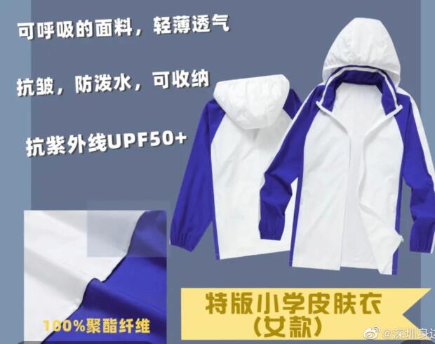 此前,深圳校服已经推出了很多新品尝试,如"冲锋衣、羽绒马甲"等,而这次推出的防晒衣校服也备受网友关注和好评。