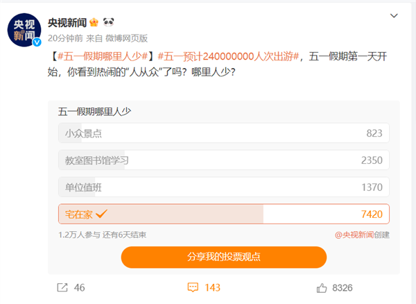 有人喜欢热闹,也有人喜欢清静。从央视发起的五一假期哪里人少”投票来看,超过60%的网友选择宅在家。还有相当一部分选择在图书馆学习、单位值班。