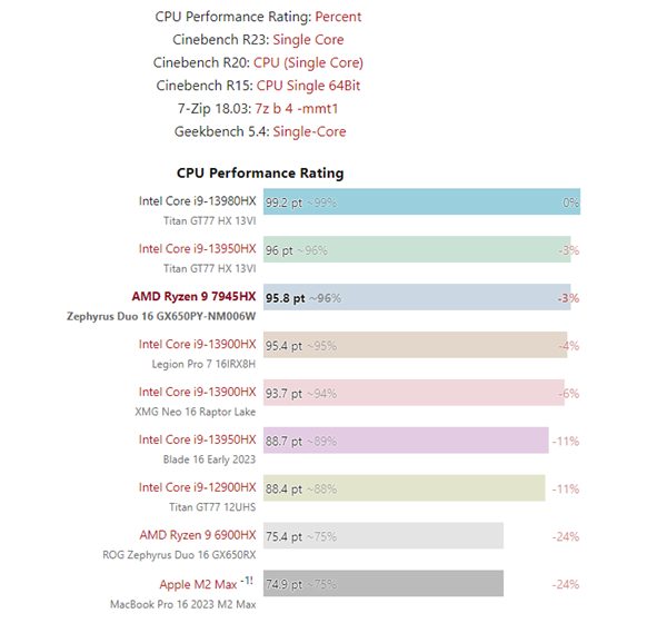 单核性能,五个项目综合下来,13980HX领先7945HX 3.5%,差距不大。