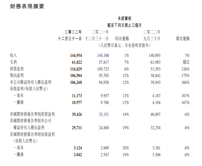 腾讯发布2022年第四季度及全年财报称,第四季度实现营收1450亿元,同比增长1%;净利润1062.7亿元,同比增长12%。