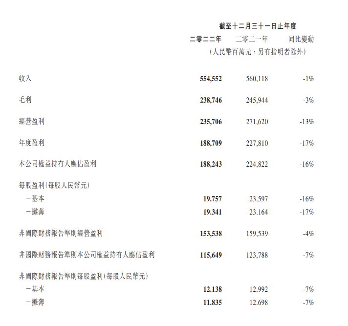 2022年,腾讯营收5545.5亿元,同比下滑1%;净利润1882.4亿元,同比下滑16%,非国际财务报告准则下,净利润1156.5亿元,同比下滑7%。
