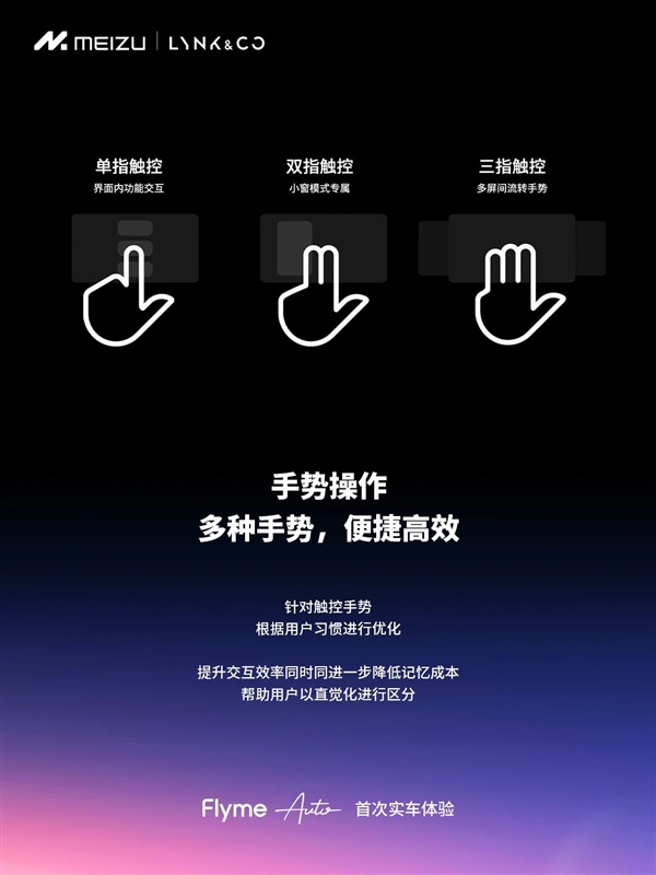 针对触控手势,Flyme Auto根据用户习惯进行优化,除了单指触控外,还支持双指触控(小窗模式专属)、三指触控(多屏间流转手势)。